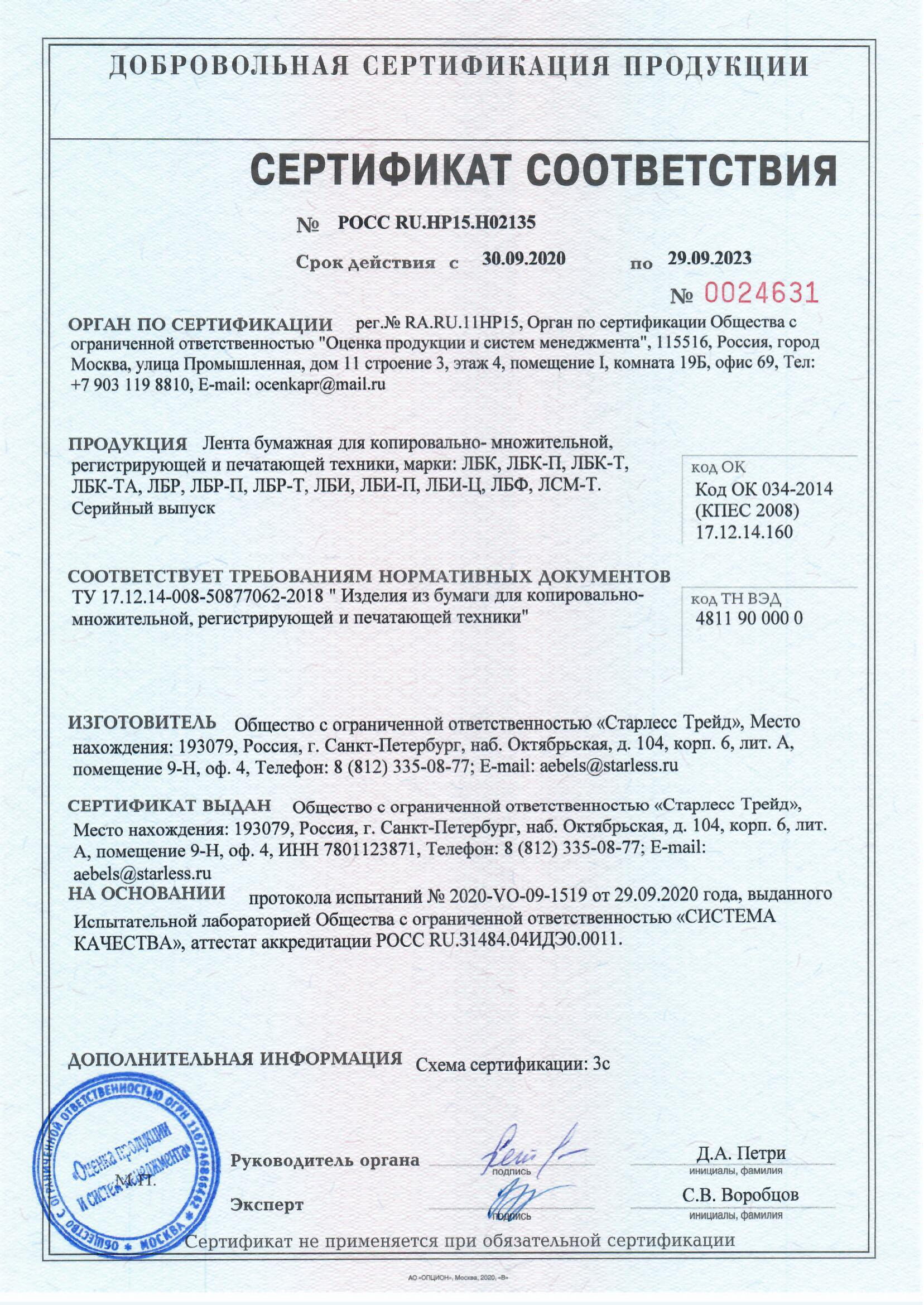 Сертификат Лента бумажная МБК и МБР