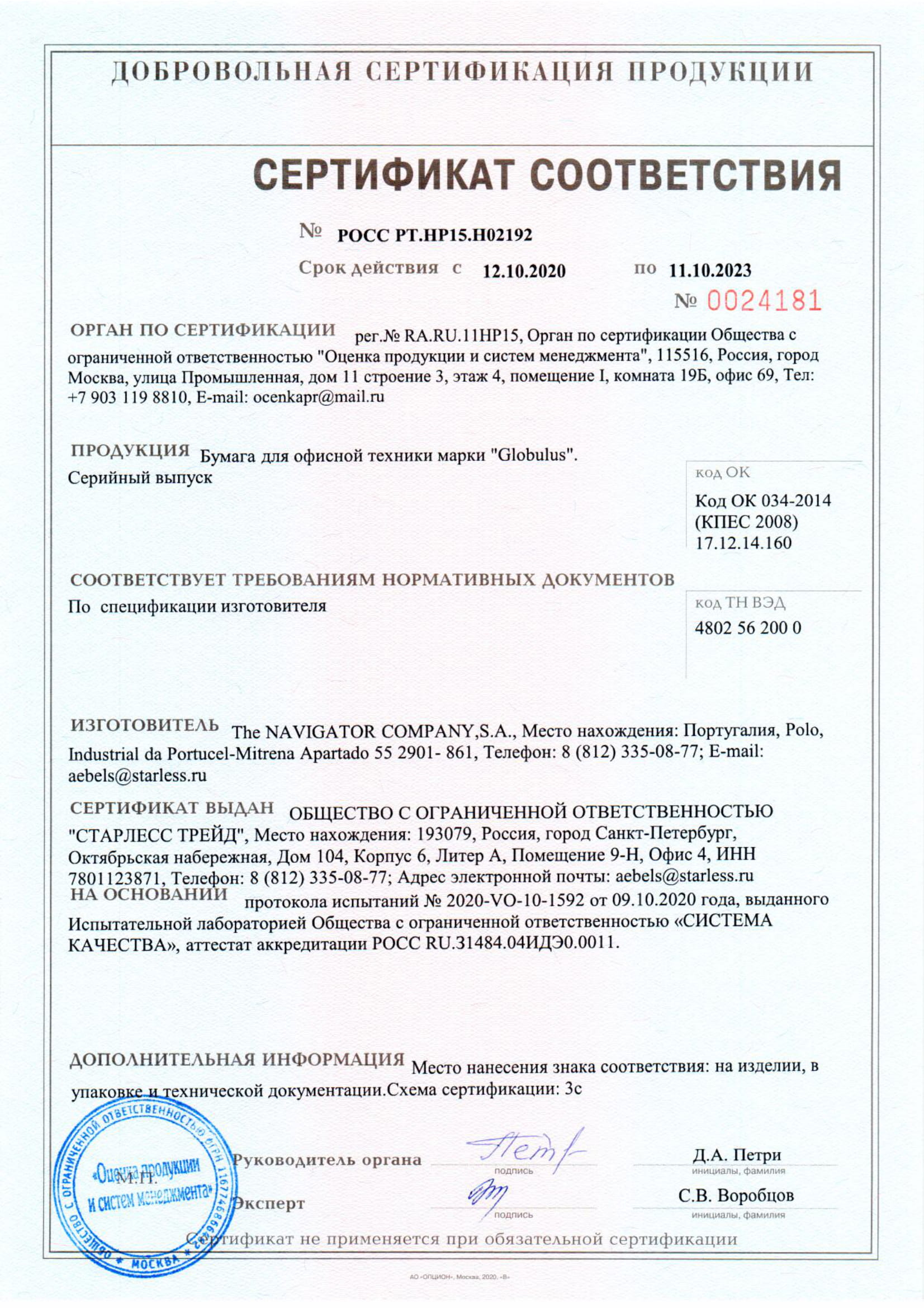 Сертификат Офисная бумага Globulus до 2023г.-1.jpg